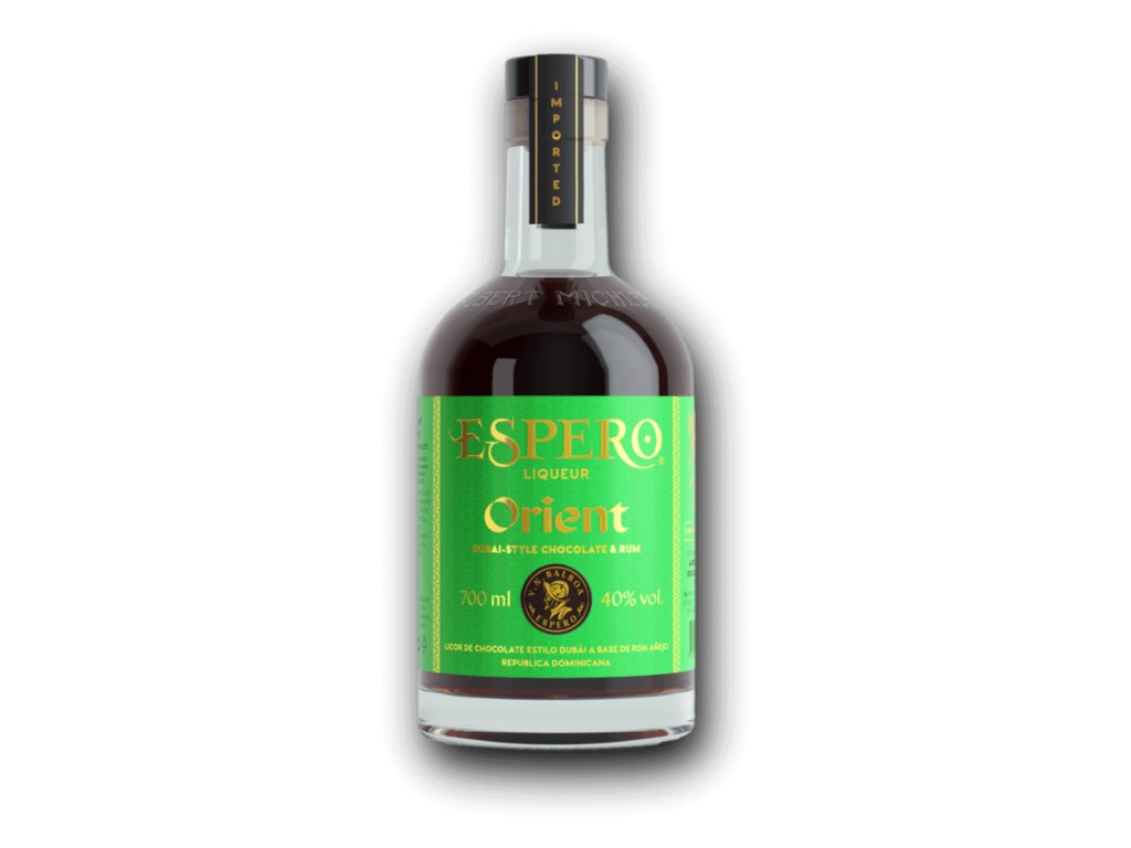 Ron Espero ORIENT Dubai Chocolate & Rum je limitovaná edice luxusního likéru s obsahem alkoholu 40 %, která spojuje jemnost karibského rumu s vytříbenými tóny kvalitní čokolády. Lahvovaná v elegantní 0,7l láhvi, představuje smyslnou kombinaci vyzrálého rumu, hořké čokolády a orientální exotiky.